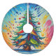 The image is a painting of a vibrant, multi-coloured Christmas tree, adorned with a white star at its top. It contains colourful stripes and splatters including bright shades of blue, red, orange, and yellow. The tree is set against a light blue background, further adding depth and colour to the scene. Overall, the image conveys a joyful and festive holiday atmosphere.