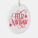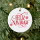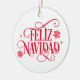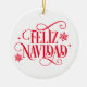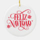 This Christmas tree ceramic ornament is shown in a round shape with festive holiday Feliz Navidad snowflakes print.