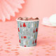 This paper holiday cup features an offset pattern of Christmas trees of all different styles and modern colours of red, turquoise, slate blue and soft yellow. A template is provided for you to add your own favourite holiday greeting, name and/or other text. Search ID175 to see other products with this design.