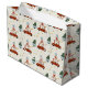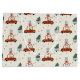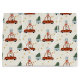 This cute gift bag is a great way to wrap your Christmas gifts. This design features and illustration of a deer driving a red card pulling a Christmas tree in a trailer.