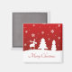 Modern minimalist simple Christmas illustration featuring white silhouettes of reindeer, tree, snowman and snowflakes with Merry Christmas greeting on a red background.