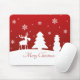 Modern minimalist simple Christmas illustration featuring white silhouettes of reindeer, tree, snowman and snowflakes with Merry Christmas greeting on a red background.