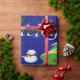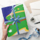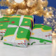 This design features a green christmas tree with red, gold and white ribbon and Christmas balls decorating the tree. Snowmen and holly decorate this design. "Merry Christmas" is printed on this design in green and white. This wrapping paper is available in assorted styles with coloured backrounds and borders.