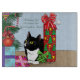 Black and white tuxedo cat surrounded by Christmas p0resents is staring up at the ornaments.
