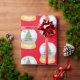 Festive holiday gift wrap features pattern of watercolor snow globes with Christmas tree on red background.