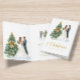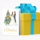 This festive greeting card features watercolors of a wedding couple standing by a Christmas tree, and gold typography with personalizable text.