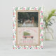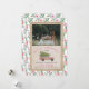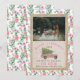Illustration of a pink wood panelled suv with Christmas tree tied to top. Border is pink floral pattern. Background is faux burlap Personalise with your family photo.