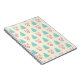 A notebook with a festive christmas pattern on a cream coloured background. Illustrations of pastel coloured, greenish-blue, christmas trees and pastel pink baubles and bows in a repeating pattern.