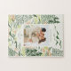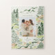 Custom puzzle with your custom family holiday photo featuring original illustrations of Christmas trees and greenery.