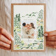 A family holiday photo card featuring original illustrations of Christmas trees and greenery.