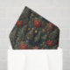 A design of decorated Christmas trees, with poinsettias, gold stars on the trees and snowflakes. The elements are raised to give a 3d effect. It looks like it has been home crafted by cutting out the elements and pasting them on paper. Interesting effect and design overall. Navy background with forest green trees, deep red for the poinsettias and gold for the stars and some baubles. A good fit for those who like floral and nature designs with a crafted handmade aesthetic.