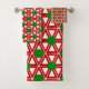 This towel set has a geometric design of repeating red and deep red triangles with green circles on top on a field of off-white. Want the same design in different colours? Message me.