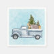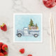 Paper napkins with a festive holiday design. A truck carrying Christmas pine trees along with some woodland animals. A bear a fox and a deer standing in the back going for a ride. Design created with watercolors.