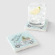 A stone coaster with a festive holiday design. A truck carrying Christmas pine trees along with some woodland animals. A bear a fox and a deer standing in the back going for a ride. Design created with watercolors.