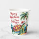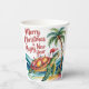 A whimsical Christmas greeting card featuring a cheerful watercolor illustration of a sea turtle sporting a festive Santa hat and adorned with twinkling Christmas lights strung around its shell, set against a backdrop of a swaying palm tree also illuminated with warm lights and a serene turquoise ocean. The turtle's shell is painted with intricate patterns of tropical flowers in soft pastel hues of coral, lavender, and seafoam green, while the ocean shimmers with subtle gradients of blue and silver, creating a peaceful yet celebratory atmosphere. "MERRY CHRISTMAS & HAPPY NEW YEAR" appears in a playful, hand-lettered font across the top of the card, with the interior offering a clean white space for a personalised message and a subtle, repeating pattern of small seashells along the bottom edge to reinforce the tropical theme. The overall tone is lighthearted and joyful, perfect for sending warm wishes to friends and family during the holiday season.