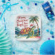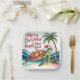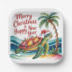 A whimsical Christmas greeting card featuring a cheerful watercolor illustration of a sea turtle sporting a festive Santa hat and adorned with twinkling Christmas lights strung around its shell, set against a backdrop of a swaying palm tree also illuminated with warm lights and a serene turquoise ocean. The turtle's shell is painted with intricate patterns of tropical flowers in soft pastel hues of coral, lavender, and seafoam green, while the ocean shimmers with subtle gradients of blue and silver, creating a peaceful yet celebratory atmosphere. "MERRY CHRISTMAS & HAPPY NEW YEAR" appears in a playful, hand-lettered font across the top of the card, with the interior offering a clean white space for a personalised message and a subtle, repeating pattern of small seashells along the bottom edge to reinforce the tropical theme. The overall tone is lighthearted and joyful, perfect for sending warm wishes to friends and family during the holiday season.
