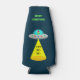 This awesome Christmas bottle cooler features a digital art image of an alien spacecraft decorated with bright coloured Christmas lights. Inside the UFO looking out through the window there is a green alien with black eyes wearing a festive Santa hat. There is a cone of light coming from the flying saucer. The shadow of a message is being projected to Earth. The message says Ho Ho UFO. Holiday greetings from outer space for all Earthlings. There is custom text so you can personalise this design with a name or message of your choice.