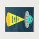 This awesome Christmas tapestry features a digital art image of an alien spacecraft decorated with bright coloured Christmas lights. Inside the UFO looking out through the window there is a green alien with black eyes wearing a festive Santa hat. There is a cone of light coming from the flying saucer. The shadow of a message is being projected to Earth. The text is customisable so you can personalise this design with your own message.. Holiday greetings from outer space for all Earthlings.