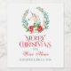 Christmas poinsettias in red and white watercolors wreath featuring cute Christmas unicorn. Merry Christmas elegant typography in red. Customisable label design.