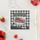 These holiday party napkins feature a winter scene of a vintage red pickup truck driving through the snow and a Christmas tree in the back. A banner above has a family name for you to personalize in a modern white typography. The background is a black and white buffalo plaid pattern with a border of pine trees. Designed by world renowned artist ©Tim Coffey.