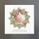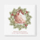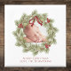 This design features a Christmas greenery foliage wreath photo magnet with a botanical photo circle wreath pine, a classic red holly berries berry, holiday simple minimalist classy, whimsical cute simple typography, holiday return address sticker label, traditional simple block style lettering, red ribbon traditional gradient, creative unique simplistic elegance, classic timeless Christmas wreath design