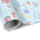 Christmas wrapping paper decorated with a pattern of watercolor Christmas objects in blue, yellow, and red on a blue background. You find trees, gits, candy, stars, socks, leaves, and berries in a festive arrangement.
