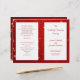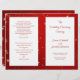 Christmas, holiday, wedding program template with text templates for a catholic church ceremony. Red twinkling stars background with white panels that hold the red text templates. This creates a layered appearance on both sides of the paper. Modern, handwritten font is used for title, names, and message on the back, with the remaining text in printed font. The last page (back of program when folded) includes a section for scripture (sample is "Love is patient, love is kind" from 1 Corinthians) and a message from the bride and groom.