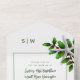 Christmas wedding invitation with attached reply cards. Starfish and holly design, for a warm climate celebration in December. Monogram initials can be added at the top. Invitation wording is modern handwritten script in full names of the couple, held by a large ampersand (and sign). All other text is printed and all text is dark green. The invitation wording and RSVP wording is framed in light green. The outside envelope colour is pale green with more sea stars and holly as the background for addresses. Printed font is used for the return address, recipient’s address, and RSVP address.
