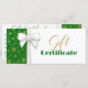 Luxury and rich holiday design featuring splendid Christmas gift bow and golden snowflakes pattern on a green background. This festive gift certificate is perfect for your small business or to gift friends and family.
