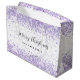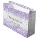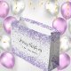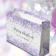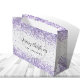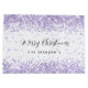 A stylish whitebackground decorated with violet, lavender coloured faux confetti, sparkles. Personalise and add your family name. Text: Merry Christmas.
