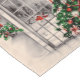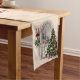 Holiday table runner with a vintage image of a Chritsmas tree in front of a window at night with candle lights glowing.