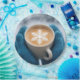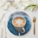 A steaming cup of coffee, decorated with a snowflake design in the froth, held in blue knitted mittens against a snowy backdrop