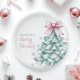 Celebrate the arrival of your little girl with this charming winter-themed baby shower Paper Plates. Featuring a teal Christmas tree adorned with a delicate blush pink bow and surrounded by pastel snowflakes, this elegant design blends festive charm with a soft, coquette touch. Perfect for creating a memorable winter baby shower with a whimsical, yet sophisticated, feel.