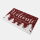 Rich Christmas red doormat with a crisp white script lettering saying "Welcome" surrounded by white stars above and a snowy forest below. Underneath the elegant welcome script of this Christmas doormat features your family's name and established date in white bracketed text.