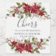 Chic floral design features "cheers to a lifetime happiness" with your names and wedding date in white, flanked by clusters of red flowers, poinsettia and berries and green foliage set white background.