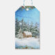 Add a peaceful Christmas winter wonderland to your gifts with these festive watercolor tags. A snow-covered cabin is nestled in the woods among the trees, with holiday greenery fringing the top and bottom.