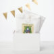 Favour bags with a whimsical watercolor painting. A young child in pyjamas and her pet kitty cat looking outside their window on Christmas Eve. Santa Claus and his reindeer flying across the night sky in silhouette form with a big full moon illuminating their path.