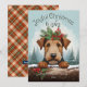 This adorable holiday greeting card features a cute Airedale Terrier dog illustration wearing a festive crown of holly, pine, and berries, with snowflakes gently falling against a winter woodland forest background. The little Airedale Terrier is peeking over the snow-capped log to say hello! The playful text "Joyful Holiday Wishes" adds a warm seasonal greeting, and can be customised as you like. The reverse side is decorated with a classic plaid check, adding a traditional touch to the overall design. This adorable card is perfect for sending holiday cheer to family and friends, and the customisable name and date make it a personalised keepsake.