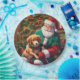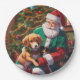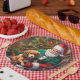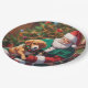 A personalised Christmas plate featuring a dog sitting on santa's lap and telling him what his christmas wishes are.