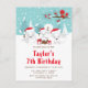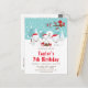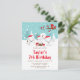This cute and fun birthday invitation features an adorable arctic fox family in a winter wonderland setting with snow capped trees and a red bird on a branch with holly. The foxes in Santa hats add a festive touch. In the background is a teal blue green sky and falling snowflakes. The text combines decorative and sans serif fonts for a stylish and modern look. This is perfect for a Christmas themed birthday.