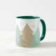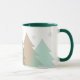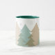 This ceramic coffee mug is shown in a refreshing image of woodlands fir tree print. Snowflakes grace the mug cascading down from the rim.