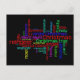Christmas word cloud text design postcard featuring all the words that mean it's Xmas time in colourful type on a black background. This word mosaic has the text arranged horizontally and vertically and has words like Santa Claus, snow, holly, noel, reindeer, Silent Night, and many more Christmas-themed sayings. A festive and colourful word cloud to help you celebrate the holiday season. A very distinctive Christmas post card.