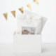 Design features a photograph of Christmas presents against a white background.