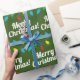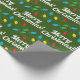 A festive christmas warpping paper with Christmas lights and a Merry Christmas writing pattern. The cusive writing is bold and therefore eyecatching.