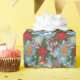 This charming Christmas wrapping paper features a delightful blue background adorned with vibrant red poinsettias, golden bells, leaping white reindeer, and cheerful gingerbread men. Accented with swirling red ribbons, glowing string lights, pine branches, and delicate snowflakes, it captures the joyful spirit of the holiday season in a classic, festive design.