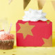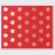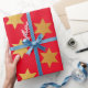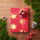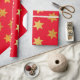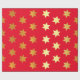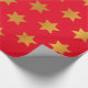 Christmas wrapping paper with a pattern of faux golden stars on a red background.