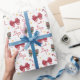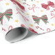 Make your holiday gifts extra special with this charming Christmas wrapping paper featuring a festive pattern of red and green bows, candy canes and golden stars on a crisp white background.