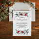 This simple and elegant holiday wedding invitation features stylish, watercolor bouquets made up of modern greenery and red and white Christmas flowers on a white background. The back of the invitation features a stylish, matching Christmas wreath.