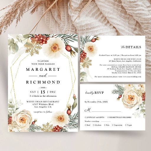 Add a touch of elegance to your wedding with our 'Christmas Wreath Floral Winter Wedding Menu'. Perfectly complementing our collection, this menu promises to impress your guests. Shop now and set the stage for a memorable dining experience!