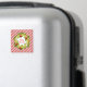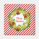 This Christmas magnet features red and white diagonal stripes, wreath with gold and red ornaments and "Merry Christmas" in a red handwriting font.